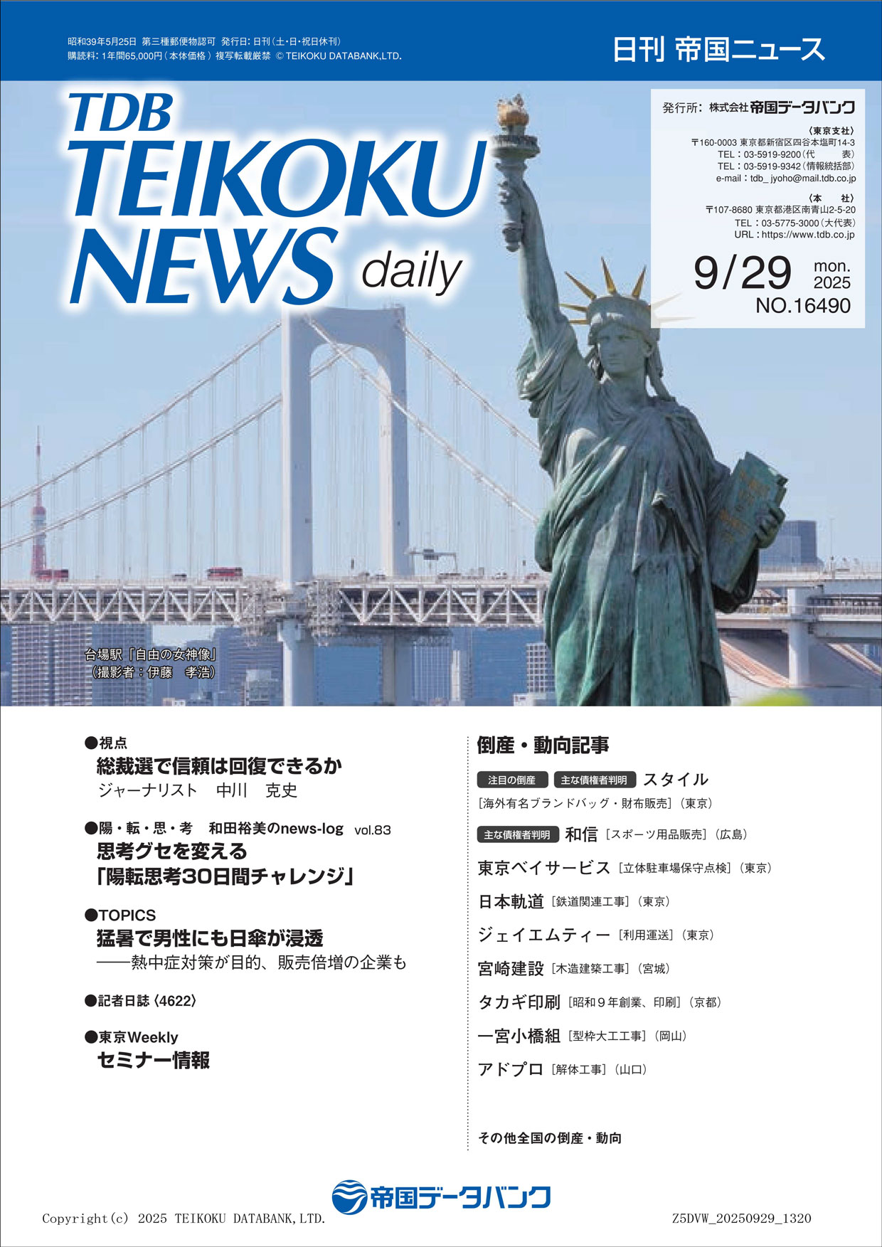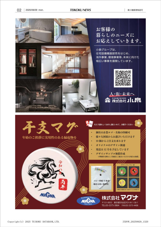 9月29日(月)発行の日刊 帝国ニュース表紙裏面に、弊社企業広告が掲載されました。