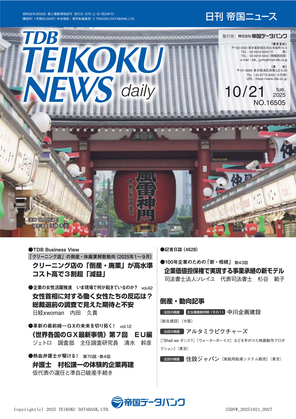 10月21日(月)発行の日刊 帝国ニュース表紙裏面に、弊社企業広告が掲載されました。