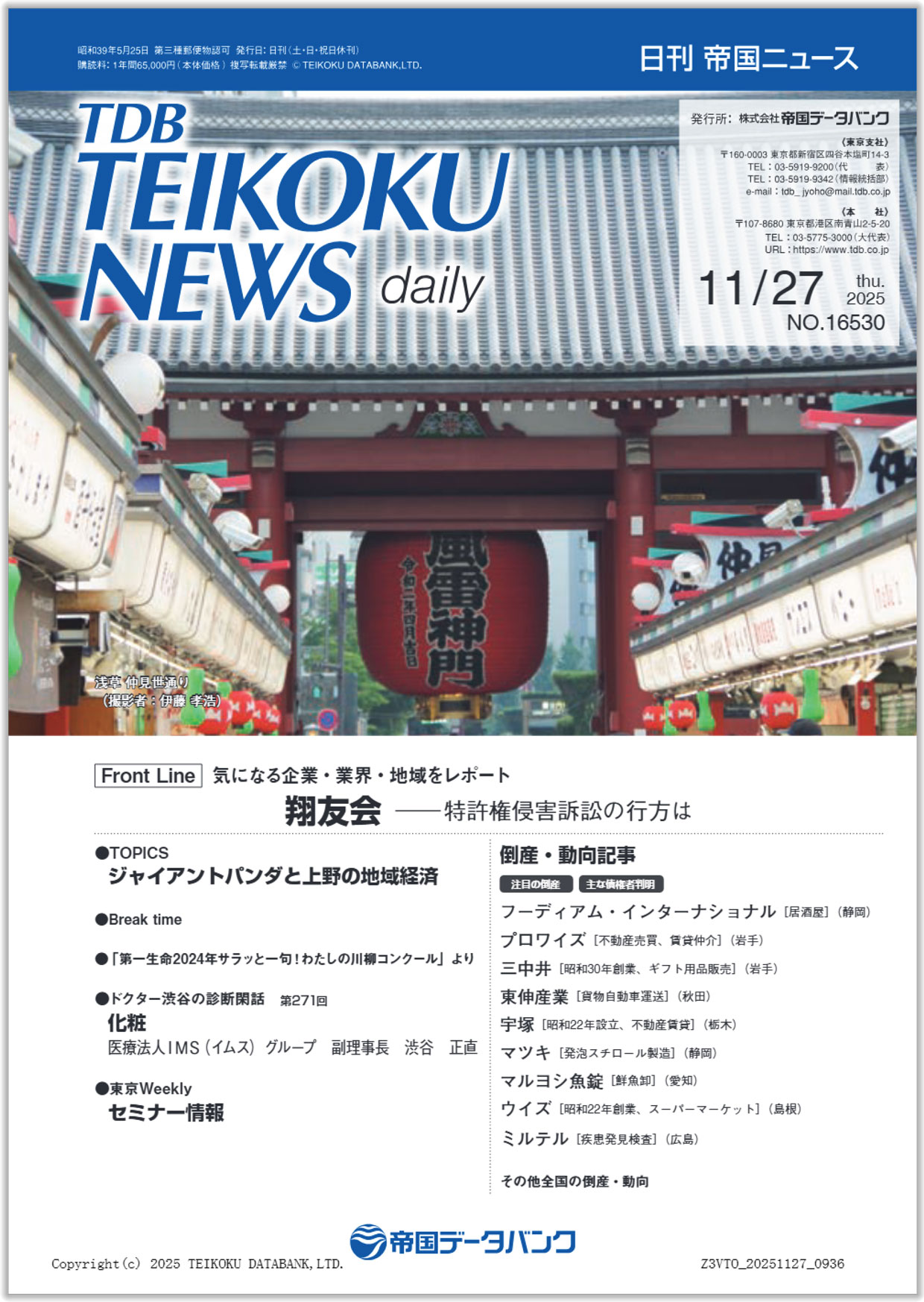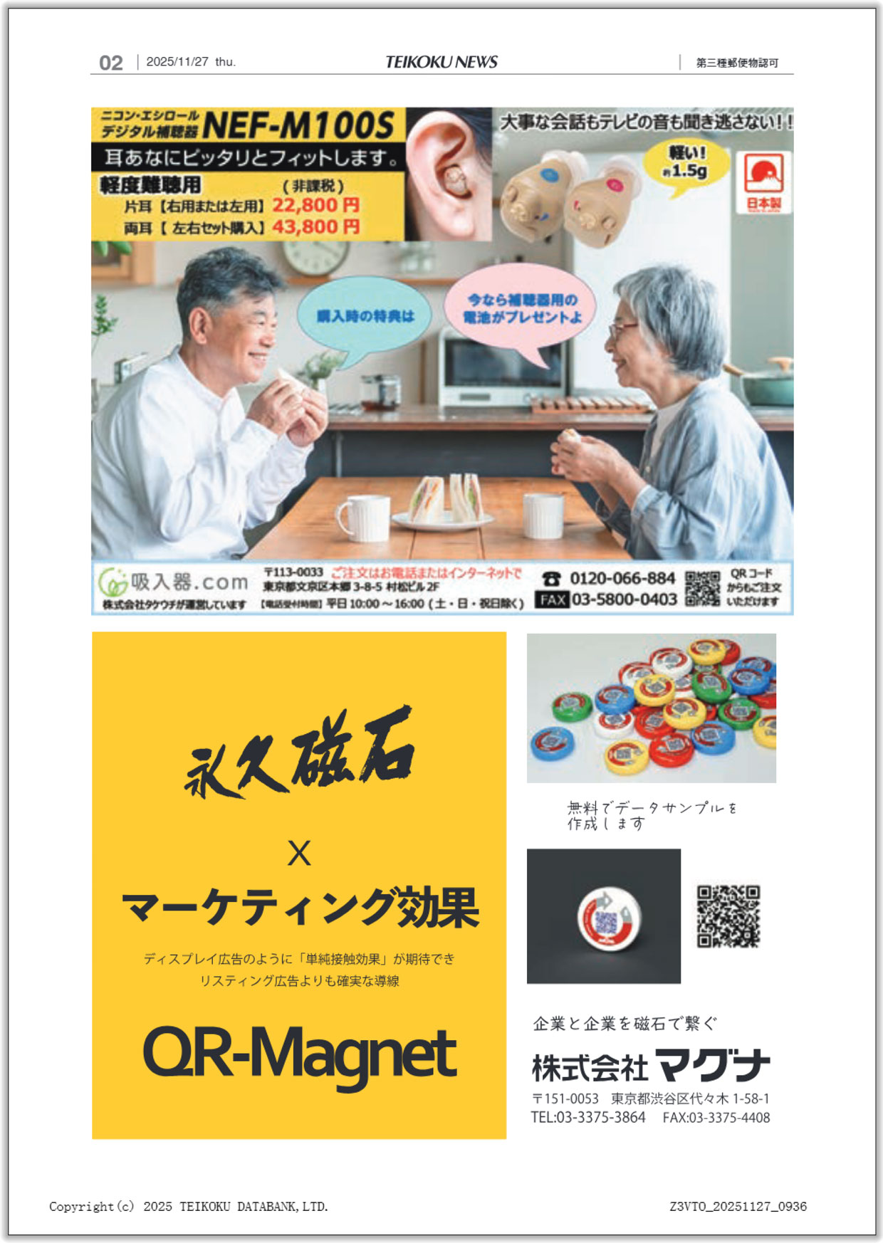 11月27日(木)発行の日刊 帝国ニュース表紙裏面に、弊社企業広告が掲載されました。