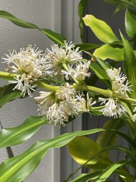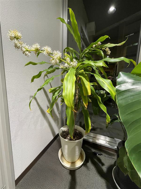 本社エレベーター前にある観葉植物「ドラセナ・マッサンゲアナ」に、このたび花が咲きました。